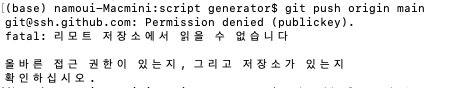 신규로 프로잭트를 하나 만들고 브랜치를 추가하려고 했는데 Permission denied (publickey) 관련 에러가 발생을했다.