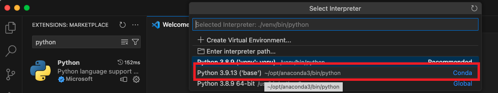 기존에 사용하던 conda를 지정해 주었다.
