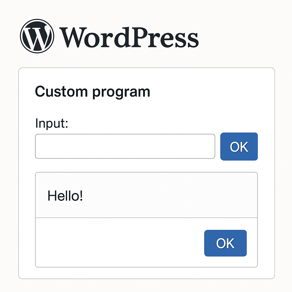 워드프레스에서 직접 만든 프로그램을 페이지나 글에서 실행하고 싶을 때,PHP와 shortcode 기능을 활용하면 아주 간단하게 구현할 수 있다.✅ 목표워드프레스 내부에서 사용자 정의 프로그램 실행shortcode로 페이지나 글에 삽입input 박스와 버튼을 클릭하면 메시지를 띄우는 간단한 예제🛠️ 구현 코드 (functions.php에 추가)function my_custom_program_viewer() { ob_start(); ?> 확인 ✅ 사용 방법워드프레스 테마의 functions.php에 위 코드 추가페이지나 글에 아래처럼 작성[my_program]페이지를 미리보기 또는 발행하면→ input 박스와 버튼이 표시되고,→ 값을 입력 후..